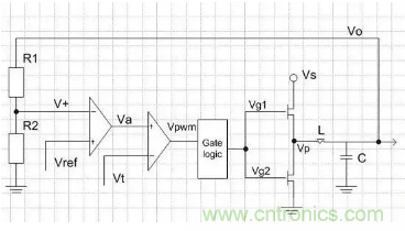 當(dāng)Vo上升時,V+將上升,Va下降,Vpwm占空比下降,經(jīng)過們邏輯之后,Vg1的占空比下降,Vg2的占空比上升,Vp占空比下降,這又導(dǎo)致Vo降低,于是Vo的上升將被抑制。反之亦然。