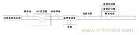在變送器輸入端放置一個溫度計,測得冷端溫度值,由分度表查得此溫度電勢值Eω,再根據(jù)熱電偶分度表的電勢值E0,由毫伏信號發(fā)生器輸出(E0-Eω)值,即模擬熱電偶的輸出,測量熱電偶溫度變送器4-20mA電流輸出值,計算變送器的測量精度。這種方法存在環(huán)境溫度變化和溫度計測量冷端誤差兩方面,無法消除這兩方面帶來的測量誤差。因此,通常作為現(xiàn)場零時比對測量時使用,不做為溫度變送器檢定校驗使用。