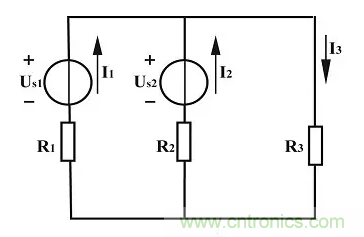 【例1】如上圖所示電路是汽車上的發(fā)電機(US1)、蓄電池(US2)和負載(R3)并聯(lián)的原理圖。已知US1=12V,US2=6V,R1=R2=1Ω,R3=5Ω,求各支路電流。