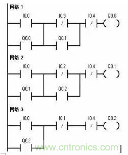 2. 單向順序停止控制電路就是要求按一定順序停止已經(jīng)執(zhí)行的各機構(gòu)。只有Q0.2被停止后才可以停止Q0.1,若想停止Q0.0,則必須先停止Q0.1。I0.4為急停按鈕。