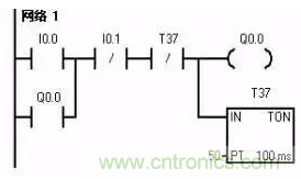 3.延時啟??刂齐娐吩撾娐芬笥休斎胄盘柡?,停一段時間輸出信號才為ON;而輸入信號0FF后,輸出信號延時一段時間才OFF。T37延時3 s作為Q0.0的啟動條件,T38延時5 s作為Q0.0的關(guān)斷條件。