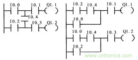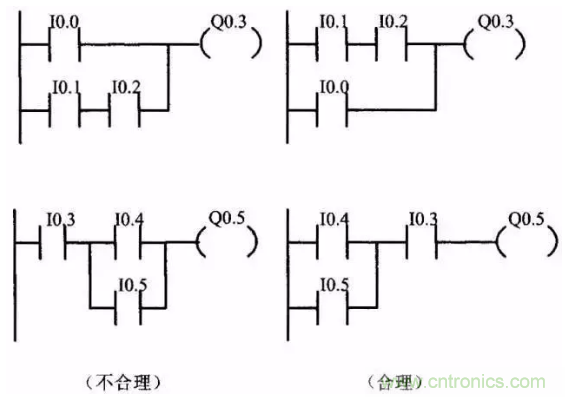 (3)幾個串聯(lián)支路相并聯(lián),應(yīng)將觸點多的支路安排在上面;幾個并聯(lián)回路的串聯(lián),應(yīng)將并聯(lián)支路數(shù)多的安排在左面。按此規(guī)則編制的梯形圖可減少用戶程序步數(shù),縮短程序掃描時間。