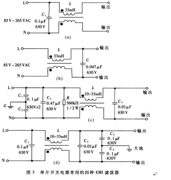 為減小體積、降低成本,單片開關電源一般采用簡易式單級EMI濾波器,典型電路如圖3所示