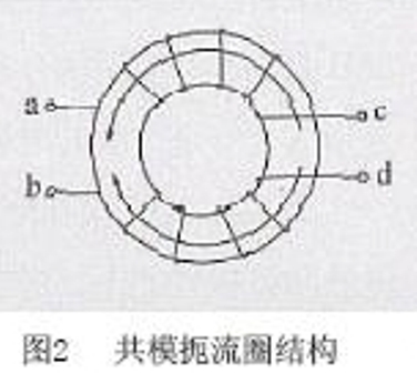 圖1 是開關(guān)電源EMI 濾波器的電路。其中L1、L2為共模扼流圈,其結(jié)構(gòu)見(jiàn)圖2。由于它的兩個(gè)線圈匝數(shù)相等,這兩個(gè)電感對(duì)于差模電流和主電流所產(chǎn)生的磁通是方向相反、互相抵消的,因而不起作用;而對(duì)于共模干擾信號(hào),能夠得到一個(gè)大的電感量呈現(xiàn)高阻抗,以獲得最大的濾波效果,因此對(duì)其有良好的抑制作用。但是,由于種種原因,如磁環(huán)的材料不可能做到絕對(duì)均勻,兩個(gè)線圈的繞制也不可能完全對(duì)稱等,使得L1和L2的電感量是不相等的,于是,(L1- L2)形成差模電感,它和L3與L4形成的獨(dú)立差模抑制電感與Cx電容器又組成L - N 獨(dú)立端口間的一個(gè)低通濾波器,用來(lái)抑制電源線上存在的差模干擾信號(hào)。