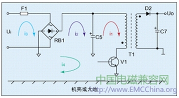 圖1中,當電源開關(guān)管V1導(dǎo)通或者關(guān)斷時,在電容器C5、變壓器T1的初級和電源開關(guān)管V1組成的電路中會產(chǎn)生脈動直流i1,如果把此電流回路看成是一個變壓器的“初級線圈”,由于電流i1的變化速率很高,它在“初級線圈”中產(chǎn)生的電磁感應(yīng),也會對周圍電路產(chǎn)生電磁感應(yīng),我們可以把周圍電路都看成是同一變壓器的多個“次級線圈”,同時變壓器T1的漏感也同樣對各個“次級線圈”產(chǎn)生感應(yīng)作用,因此電流i1通過電磁感應(yīng),在每個“次級線圈”中都會產(chǎn)生的感應(yīng)電流,我們分別把它們記為i2、i3、i4 •••。