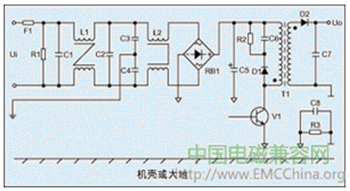 其中i2和i3是差模干擾信號,它們可以通過兩根電源線傳導(dǎo)到電網(wǎng)的其它線路之中和干擾其它電子設(shè)備;i4是共模干擾信號,它是電流i1回路通過電磁感應(yīng)其它電路與大地或機殼組成的回路產(chǎn)生的,并且其它電路與大地或機殼是通過電容耦合構(gòu)成回路的,共模干擾信號可以通過電源線與大地傳導(dǎo)到電網(wǎng)其它線路之中和干擾其它電子設(shè)備。