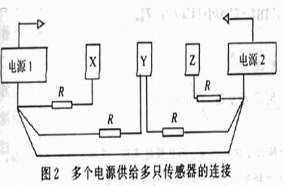 當使用單電源供給多只傳感器時,其連接方法如圖1所示,以盡量減少接地電阻引進的干擾,若供電電源的壓降必須減到最小,則電源高端導線也可按相似的方法接線。