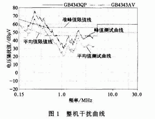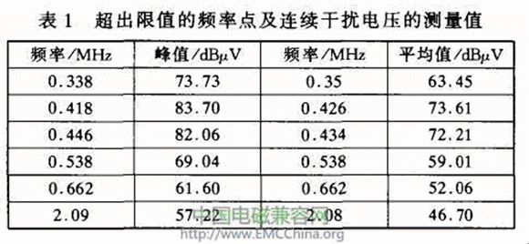 圖1是某一臺(tái)空調(diào)產(chǎn)品連續(xù)干擾電壓的測(cè)試曲線(xiàn)(執(zhí)行GtM343.1—2003《家用和類(lèi)似用途電動(dòng)、電熱器具,電動(dòng)工具以及類(lèi)似電器無(wú)線(xiàn)電干擾特性測(cè)量方法和允許值》l11)。表1是超出限值的一些頻率點(diǎn)及連續(xù)干擾電壓的峰值和平均值的測(cè)量值。