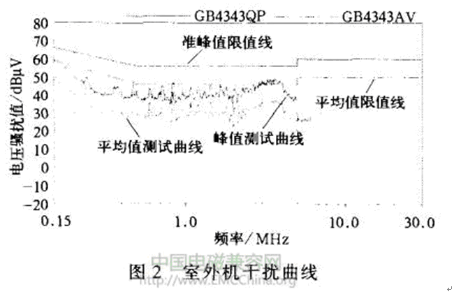 從圖2可以看出,測(cè)量的連續(xù)干擾電壓的峰值曲線(xiàn)和平均值曲線(xiàn)均沒(méi)有超過(guò)限值線(xiàn),且有一定的裕量,由此可以排除室外機(jī)控制器和壓縮機(jī)干擾的可能。
