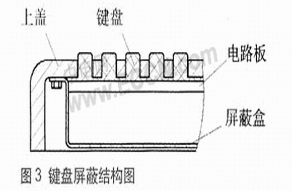 本終端鍵盤(pán)采用硅橡膠專(zhuān)用鍵盤(pán),安裝在上蓋表面,開(kāi)口較多,易引起電磁泄漏,降低屏蔽效能。因?yàn)榭卓p對(duì)電磁波的衰減與干擾波波長(zhǎng)及孔縫尺寸有關(guān),一般應(yīng)使孔洞的尺寸遠(yuǎn)小于電磁波的波長(zhǎng),只要孔縫的直徑足夠小,就能夠達(dá)到所要求的屏蔽效能。但一般按鍵的大小、排列應(yīng)符合人們的操作習(xí)慣,按鍵太小使用不方便,故這里主要采取安裝屏蔽罩的方法來(lái)減少電磁泄漏。鍵盤(pán)的屏蔽結(jié)構(gòu)設(shè)計(jì)如圖3所示。