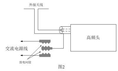 圖2是電視機防雷擊電路,圖中防雷擊電路是在PCB電路板上直接制作放電間隙(6mm)裝置,在外接天線端口就近與電網(wǎng)輸入引線之間加接這種放電間隙裝置。由于電視機本身沒有金屬機殼或機殼接地電氣連接點,所以防雷放電間隙可直接利用電網(wǎng)輸入電源引線代替地線使用。