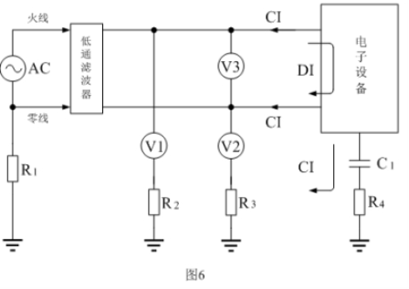 傳導(dǎo)干擾一般是通過(guò)電壓或電流的形式在電路中進(jìn)行傳播的,圖6是測(cè)試電子設(shè)備產(chǎn)生傳導(dǎo)干擾的基本方法,或表示傳導(dǎo)干擾通過(guò)電源線傳輸?shù)膸追N方式。圖6中,電子設(shè)備表示干擾信號(hào)源,CI表示共模干擾信號(hào),DI表示差模干擾信號(hào);V1、V2、V3分別表示用儀表對(duì)干擾信號(hào)進(jìn)行測(cè)量的連接方法,低通濾波器是為了便于對(duì)V1、V2、V3進(jìn)行測(cè)試,而另外加接進(jìn)去的;R1、R2、R3、R4分別為各電子設(shè)備的接地電阻,也包括大地之間的電阻,接地電阻一般為幾歐姆到幾十歐姆,其阻值與地線的安裝和地表面土壤結(jié)構(gòu)有關(guān);C1為電子設(shè)備對(duì)大地的電容,其容量與電子設(shè)備的體積還有地面距離有關(guān),一般為幾微微法到幾千微微法。從圖6中我們可以看出: