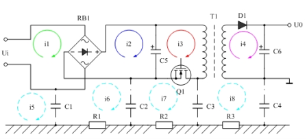 圖7是一個(gè)開關(guān)電源電路的幾個(gè)主要部分,圖中,C1、C2、C3、C4是各主要部分的對(duì)地電容或?qū)C(jī)殼的電容,R1、R2、R3是地電阻或機(jī)殼的電阻(機(jī)殼接地);i1、i2、i3、i4是開關(guān)電源電路中幾個(gè)主要部分的回路電流,i1是交流輸入回路電流,i2是整流回路電流,i3是開關(guān)回路電流,i4是輸出整流回路電流。在這4個(gè)電流之中,i3的作用是最主要的,因?yàn)樗荛_關(guān)管Q1控制,其它電流全部都受它牽動(dòng)而發(fā)生變化。