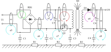 圖8是磁感應(yīng)產(chǎn)生傳導(dǎo)干擾的原理圖,圖8表示開(kāi)關(guān)電源變壓器產(chǎn)生的漏磁通穿過(guò)其它電路時(shí),在其它電路中也產(chǎn)生感應(yīng)電動(dòng)勢(shì),其中漏磁通M1、M2、M3產(chǎn)生的感應(yīng)電動(dòng)勢(shì)e1、e2、e3屬于是差模干擾信號(hào);M5、M6、M7、M8產(chǎn)生的感應(yīng)電動(dòng)勢(shì)e5、e6、e7、e8屬于是共模干擾信號(hào)。