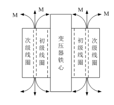 圖9是開(kāi)關(guān)電源變壓器產(chǎn)生的漏磁通的原理圖。開(kāi)關(guān)電源變壓器的漏磁通大約在5%~20%之間,反激式開(kāi)關(guān)電源變壓器為了防止磁飽和,在磁回路中一般都留有氣隙,因此漏磁通比較大,即:漏感比較大。因此,產(chǎn)生漏感干擾也特別嚴(yán)重,在實(shí)際應(yīng)用中,一定要用銅箔片在變壓器外圍進(jìn)行磁屏蔽。從原理上來(lái)說(shuō),銅箔片不是導(dǎo)磁材料,對(duì)漏磁通是起不到直接屏蔽作用的,但銅箔片是良導(dǎo)體,交變漏磁通穿過(guò)銅箔片的時(shí)候會(huì)產(chǎn)生渦流,渦流產(chǎn)生的磁場(chǎng)方向正好與漏磁通的方向相反,是部分漏磁通被抵消,因此,銅箔片也可以起到磁屏蔽的作用。