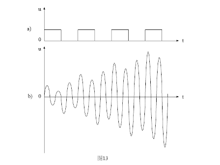 圖13是諧振回路產(chǎn)生諧振的工作原理圖。圖13-a)是一個(gè)含有諧波分量非常豐富的電壓方波,圖13-b)是LC串聯(lián)回路產(chǎn)生諧振時(shí)的電壓波形。當(dāng)電壓方波作用于LC串聯(lián)回路時(shí),方波的前后沿都會(huì)對(duì)LC串聯(lián)回路產(chǎn)生激勵(lì)(即接收能量),每次激勵(lì)過(guò)后又會(huì)產(chǎn)生阻尼振蕩(即損耗能量),當(dāng)輸入電壓波形的上升率dv/dt值大于諧振回路波形(正弦波)的上升率時(shí),電路就會(huì)產(chǎn)生激勵(lì);當(dāng)輸入電壓波形的上升率dv/dt值小于諧振回路波形的上升率時(shí),電路就會(huì)產(chǎn)生阻尼。
