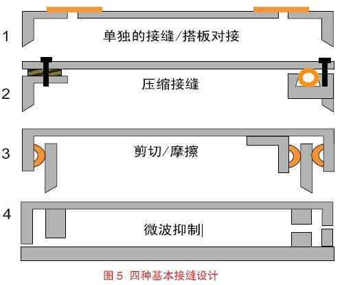 有四種不同構(gòu)造的接縫形式可供選擇,即(1) 單獨接縫,(2) 壓縮接縫,(3) 剪切或摩擦接縫,(4) 絕緣或阻塞抑制接縫。這些接縫的結(jié)構(gòu)如圖5 所示。最能夠代表單獨接縫的是搭板對接。示例中的頂部和底部接縫處于安裝在機(jī)架上的空白面板或活頁抽屜之間。因為沒有交疊,所以很難應(yīng)用傳統(tǒng)的襯墊材料。此時傾向使用的密封方法是在接縫處使用帶背襯粘合的導(dǎo)電薄片或織物帶。