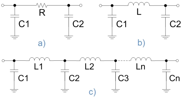 圖1:常見EMI/RFI濾波器類型的結(jié)構(gòu)示意圖:a)π型RC;b)π型LC;c)LC梯形。