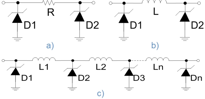 圖2:集成型EMI濾波+ESD保護(hù)方案:a)π型RC;b)π型LC;c)LC梯形