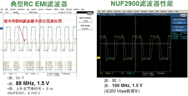 圖4:典型RCEMI濾波器與高速LCEMI濾波器(NUF2900)的響應(yīng)性能比較。