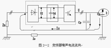 寄生電容Cp存在于電機(jī)電纜和電機(jī)內(nèi)部,因此變頻器的PWM輸出電壓波形的開關(guān)翼部通過(guò)寄生電容產(chǎn)生一個(gè)高頻脈沖電流Is,使變頻器成為一個(gè)諧波干擾源。由于諧波電流Is的產(chǎn)生源是變頻器,因此它一定要流回變頻器。圖中Ze為大地阻抗,Zn為動(dòng)力電纜與地之間的阻抗。諧波電流流過(guò)此二阻抗所造成的電壓降,將影響到同一電網(wǎng)上的其它設(shè)備造成干擾。[page]