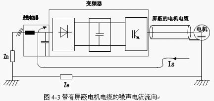 使用屏蔽電機(jī)電纜:對(duì)于高頻干擾,如果高次諧波干擾電流Is有一條合理的通道,則高頻干擾是可以得到抑制的。如果使用非屏蔽電纜,則高次干擾諧波電流Is以一個(gè)不確定的路線流回變頻器,并在此回路中產(chǎn)生高頻分量壓降,影響干擾其它設(shè)備。為使高次諧波干擾電流Is能沿確定路線流回變頻器,需要采用屏蔽電機(jī)電纜(如圖4-3所示)。電纜屏蔽層必須連接到變頻器外殼和電機(jī)外殼上,當(dāng)高次諧波干擾電流Is必須回變頻器時(shí),屏蔽層形成一條有效的通道。這樣,高次諧波干擾電流就不會(huì)在Ze上產(chǎn)生壓降,在Zn上的壓降可由進(jìn)線電抗干擾濾波器來(lái)抑制(如圖4-2中的F12)。