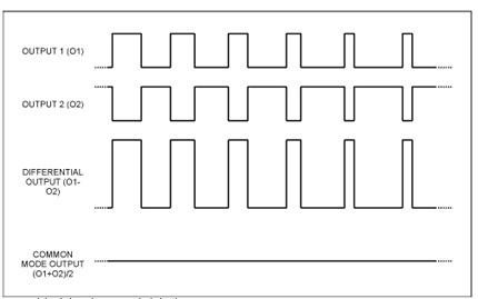 如圖1所示,如果器件的反相和同相輸出回路具有較高的匹配度,則兩個對稱輸出信號波形在揚聲器或連線上將具有很小的共模(CM)信號(底部的跡線)。注意:50%占空比代表零輸入信號(空閑狀態(tài))。因此,可以設(shè)計一個差分低通濾波器,用于衰減信號波形中高頻分量(快速切換所產(chǎn)生的),同時保留有用的低頻分量以輸出到揚聲器。