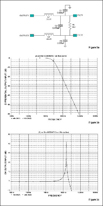 圖3a給出了傳統(tǒng)的PWM型D類輸出LC濾波器,及其理想值。為簡單起見,可假設(shè)揚聲器負(fù)載具有理想的8電阻,并且忽略電感的直流阻抗。通過一些簡單的SPICE仿真便可得出問題所在。圖3b給出了圖3a中濾波器對差分輸入信號的頻率響應(yīng)。給出了兩個輸出結(jié)點(FILT1,F(xiàn)ILT2)相對于GND的響應(yīng)曲線。圖中給出的器件值在30kHz的頻率以上具有理想的二階滾降,以及理想的瞬態(tài)。音頻帶內(nèi)群延遲特性在4μs內(nèi)保持平坦。