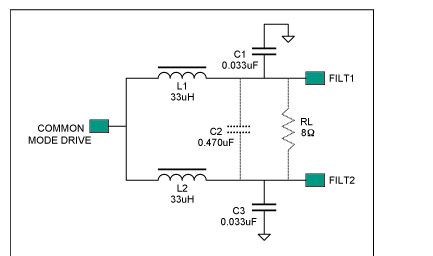 此類D類放大器對輸出濾波器的要求,不同于具有傳統(tǒng)差分輸入和互補(bǔ)PWM輸出的放大器。與PWM相比,MAX9704調(diào)制方案的輸出往往含有較高的共模信號,設(shè)計輸出濾波器時需要考慮這點。正如后面的實例所示,傳統(tǒng)差分濾波器拓?fù)浣Y(jié)構(gòu)的效果往往不太理想。