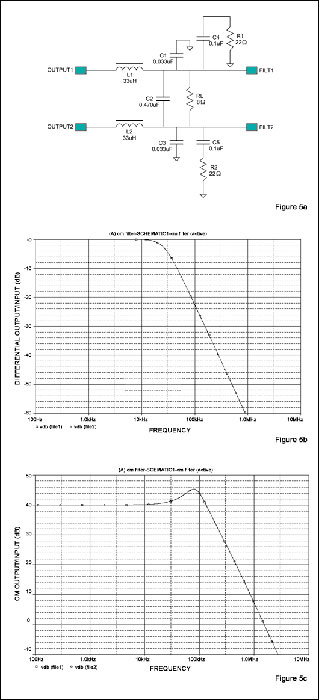 圖5.在傳統(tǒng)LC濾波器的每個輸出端增加一個RC網(wǎng)絡(luò)(a),可以改進(jìn)差分信號的頻響(b)和共模信號的頻響(c)。