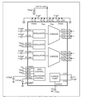 有些低開關(guān)頻率(200kHz至300kHz)應(yīng)用不適合采用圖5c所示的方案。對于這類產(chǎn)品可能需要采用其他方法和拓?fù)浣Y(jié)構(gòu)。MAX9704立體音D類放大器(圖6)可設(shè)置為940kHz固定頻率模式(FFM)(FS1=低,F(xiàn)S2=高),此時效果最佳。工作在FFM模式下的MAX9704通過引腳選擇將開關(guān)周期設(shè)為恒定值(具有三個可選項),以滿足應(yīng)用需求。