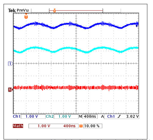 圖7.用MAX9704驅(qū)動圖5a電路時FILT1和FILT2上產(chǎn)生的信號波形(同時顯示在頂部的跡線),以及差分輸出(底部的跡線)。
