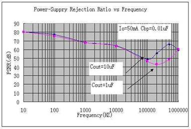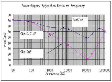 如圖為輸出電容對(duì)PSRR的影響。大電容器一般在一定頻率范圍內(nèi)會(huì)提高電源抑制比(PSRR)