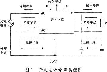 如圖1所示,電網(wǎng)中含有的共模和差模噪聲對(duì)開(kāi)關(guān)電源產(chǎn)生干擾,開(kāi)關(guān)電源在受到電磁干擾的同時(shí)也對(duì)電網(wǎng)其他設(shè)備以及負(fù)載產(chǎn)生電磁干擾,例如返回噪聲、輸出噪聲和輻射干擾等。進(jìn)行開(kāi)關(guān)電源EMI/EMC設(shè)計(jì)時(shí),一方面要防止開(kāi)關(guān)電源對(duì)電網(wǎng)和附近的電子設(shè)備產(chǎn)生干擾;另一方面要加強(qiáng)開(kāi)關(guān)電源本身對(duì)電磁干擾環(huán)境的適應(yīng)能力。下面用等效電路分別介紹共模和差模干擾產(chǎn)生的原因及路徑。