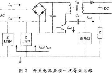 如圖2所示,當(dāng)開(kāi)關(guān)管轉(zhuǎn)為“關(guān)”時(shí),集電極與發(fā)射極間的電壓快速上升達(dá)500V,他產(chǎn)生的電流經(jīng)集電極與地之間的分布電容返回整流橋,這個(gè)按開(kāi)關(guān)頻率工作的脈沖串電流是共模噪聲。這個(gè)電壓會(huì)引起共模電流Icm2向CP2充電和共模電流Icm1向CP1充電,其中CP1為變壓器初、次級(jí)之間的分布電容,CP2為開(kāi)關(guān)電源與散熱器之間的分布電容(即開(kāi)關(guān)管集電極與地之間的分布電容)。則線路中共模電流總大小為Icm1+Icm2。