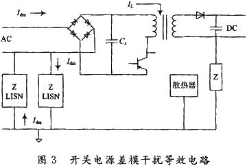 如圖3所示,當(dāng)開(kāi)關(guān)管轉(zhuǎn)為“開(kāi)”時(shí),儲(chǔ)能電容Cs的能量由AC電網(wǎng)和整流橋提供,他被開(kāi)關(guān)管變換器的快速開(kāi)關(guān)頻率所變換,并通過(guò)變壓器形成脈沖電流IL,他具有非常豐富的開(kāi)關(guān)頻率諧波。儲(chǔ)能電容不是一個(gè)純電容,他有串聯(lián)電阻和電感。當(dāng)整流橋處開(kāi)關(guān)管“開(kāi)”時(shí),在AC電網(wǎng)端,IL會(huì)產(chǎn)生一個(gè)由電容的L,R,C所呈現(xiàn)的阻抗電壓,這就是開(kāi)關(guān)電源產(chǎn)生差模發(fā)射源的原理。差模電流Idm和信號(hào)電流IL沿著導(dǎo)線、變壓器初級(jí)、開(kāi)關(guān)管組成的回路流通。
