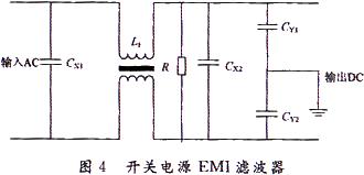 濾波是抑制傳導(dǎo)干擾的一種很好的辦法。在電源輸入端接上濾波器,即可以抑制開(kāi)關(guān)電源產(chǎn)生并向電網(wǎng)反饋的干擾,也可以抑制來(lái)自電網(wǎng)的噪聲對(duì)電源本身的侵害。開(kāi)關(guān)電源的工作頻率一般在10~130kHz,對(duì)開(kāi)關(guān)電源產(chǎn)生的高頻段EMI信號(hào),只要選擇相應(yīng)的去耦電路或網(wǎng)絡(luò)結(jié)構(gòu)較為簡(jiǎn)單的EMI濾波器,就能達(dá)到理想的濾波效果。干擾抑制電路如圖4所示,CX1和CX2叫做差模電容,L1叫做共模電感,CY1和CY2叫做共模電容。電阻R用于消除可能在濾波器中出現(xiàn)的靜電積累。IEC-380安全技術(shù)條件標(biāo)準(zhǔn)的8.8部分指出,若CX>0.1μF則R=t/2.2C(t=1s,C=2CXμF)。