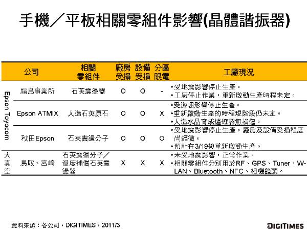 DIGITIMES Research最新報(bào)告指出,日本311強(qiáng)震造成日廠手機(jī)/平板相關(guān)零組件供應(yīng)商分別遭受廠房、設(shè)備損壞,亦或海嘯沖擊、地方分區(qū)限電等影響,工廠作業(yè)停擺,影響超過20處工廠,在災(zāi)后截至2011年3月16日仍未能正常作業(yè)。