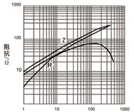 鐵氧體的效果隨著頻率的升高而增加。鐵氧體扼流圈的阻抗在10MHz處通常為幾十歐姆,當(dāng)頻率超過100MHz時,阻抗升高到數(shù)百歐姆(具體值取決于形狀和尺寸,鐵氧體體積越大,阻抗越大)。不同廠家的產(chǎn)品或同一廠家的不同種類的鐵氧體,其阻抗隨頻率的變化都有所不同。圖5是尺寸相同(外徑為5mm,長度為11mm)但材料不同的兩種鐵氧體的特性。