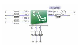 用CST印制板工作室對該PCB生成網(wǎng)格后,建立如圖9所示的電路以仿真裸板情況下的輸入阻抗特性。該電路中在原本加電容的位置用100MΩ代替以模擬開路情況下的阻抗。