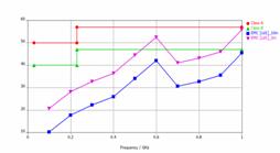 對于電子產(chǎn)品的電磁輻射,國際電工委(IEC:InternationalElectrotechnicalCommission)制定了強制標(biāo)準。通常,印制板都只是系統(tǒng)中的一部分,在進行電磁輻射分析的時候除了要考慮印制板本身的輻射問題外,還需要考慮系統(tǒng)中其它設(shè)備對對電磁輻射的影響,尤其是帶有通風(fēng)孔機箱的屏蔽效能。CST印制板工作室在進行SI仿真的同時,可以得到印制板上電流分布的幅度和相位信息,并通過與CST微波工作室的協(xié)同將該電流分布作為激勵源,然后再加上機箱,充分考慮孔、縫對電磁輻射的影響。仿真的結(jié)果自動與內(nèi)嵌的EMC國際標(biāo)準限值進行對比,如圖16所示。