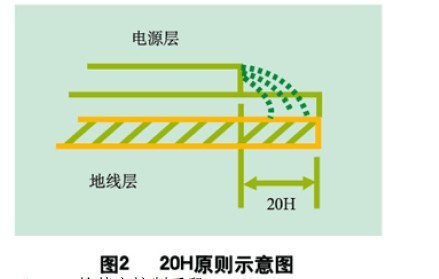 為了減小電源的邊緣輻射,電源/地平面應(yīng)遵循20H設(shè)計(jì)原則,即地平面尺寸比電源平面尺寸大20H(見圖2),這樣邊緣場(chǎng)輻射強(qiáng)度可下降70% 。