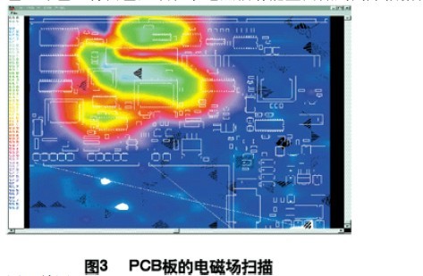 利用電磁輻射掃描儀,對(duì)裝聯(lián)并上電后的機(jī)盤掃描,得到PCB中電磁場(chǎng)分布圖(如圖3,圖中紅色、綠色、青白色區(qū)域表示電磁輻射能量由低到高),根據(jù)測(cè)試結(jié)果改進(jìn)PCB設(shè)計(jì)。