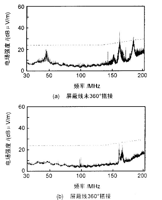 減小空間輻射測試曲線如圖4 所示。圖4(a)是一臺外接屏蔽電纜的設(shè)備的測試曲線,電纜與接口連接器相連的地方都是將屏蔽層擰成一條小辮(又稱Pigtail),然后固定到連接器的螺釘上。屏蔽電纜能控制共模輻射是因為共模電流提供了一個低阻抗通路,使共模電流通過屏蔽層流回共模電壓源。電纜屏蔽層提供的共模電流通路的阻抗由電纜本身的阻抗及電纜與金屬機箱之間的搭接阻抗2 部分組成。因為電纜與金屬機箱之間的搭接阻抗(Pigtail的阻抗)較大,這就使得屏蔽層上形成了一個較大的共模電壓,在該電壓的驅(qū)動下,電纜屏蔽層上會產(chǎn)生共模電流,因而屏蔽層變成了天線向外輻射。將Pigtail連接改成360 壓接在連接器的金屬外殼上,保證低阻抗搭接,測試結(jié)果如圖4(b)所示。