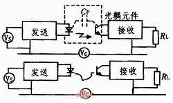 用光傳輸信號是解決地環(huán)路問題的理想方法。如圖3所示,光耦器件的寄生電容為2 pF左右,因此能夠在很高的頻率起到隔離作用。如果使用光纖,則沒有寄生電容的問題,能夠獲得十分完善的隔離效果。但是,用光纖會帶來其它問題,如:需要更大的功率、需要更多的外圍器件,光連接的線形和動態(tài)范圍都達不到模擬信號的要求、光纜的安裝和維護比較復雜等,使用時應注意。