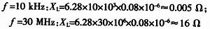 當一段導線與其他導線遠離并且其長度遠大于寬度時,導線的自感量為0.8 μH/m,那么10 cm長的導線的電感量是0.08μH。再由下面的公式求出導線感抗:XL=2πfL,下式中,f為導線通過信號的頻率(Hz),L為單位長度導線的自感量(H)。所以分別計算出該導線在低頻和高頻下的感抗值: