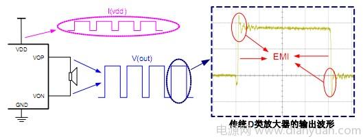傳統(tǒng)D類(lèi)放大器開(kāi)關(guān)輸出的拓?fù)浣Y(jié)構(gòu)是一個(gè)很好的EMI發(fā)射源:如調(diào)制的開(kāi)關(guān)信號(hào),開(kāi)關(guān)信號(hào)的邊沿變化,電源線上變化的電流信號(hào)等都會(huì)產(chǎn)生大量的EMI,如下圖所示。