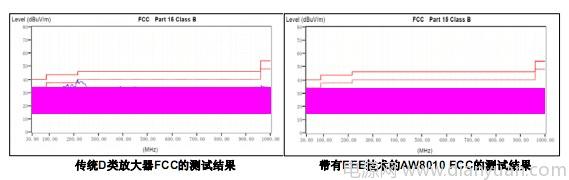 下面是傳統(tǒng)D類(lèi)放大器和帶有EEE技術(shù)的AW8010的EMI測(cè)試結(jié)果,測(cè)試使用60cm(24inch)的輸出線。上面的紅色實(shí)線是FCC CLASS B的標(biāo)準(zhǔn)線,紅色虛線是-6dB的裕量線,藍(lán)色的線是實(shí)際測(cè)試曲線,粉色的線是測(cè)試環(huán)境的EMI背景噪音。