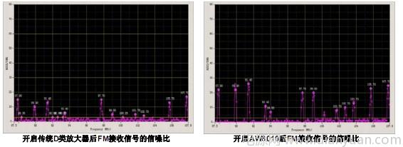 下圖是傳統(tǒng)D類(lèi)放大器和帶EEE技術(shù)的AW8010對(duì)FM接收信號(hào)的信噪比影響。傳統(tǒng)D類(lèi)放大器對(duì)FM的影響很?chē)?yán)重,信號(hào)變差甚至丟臺(tái),而帶EEE技術(shù)的AW8010對(duì)FM影響很小,降低了系統(tǒng)工程師的調(diào)試難度。