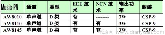 高效率、低功耗使得D類(lèi)放大器的應(yīng)用越來(lái)越廣泛,D類(lèi)放大器EMI也越來(lái)越受到關(guān)注。采用艾為帶有EEE技術(shù)的AW8010、AW8110、AW8145,極大地降低了EMI的輻射,簡(jiǎn)化了設(shè)計(jì)。其中音樂(lè)功放AW8110、AW8145同時(shí)還采用了獨(dú)特的、擁有專(zhuān)利保護(hù)的無(wú)破音(NCN:Non-Crack-Noise)技術(shù),提高音質(zhì)的同時(shí)有效地保護(hù)揚(yáng)聲器,是音樂(lè)手機(jī)等便攜式設(shè)備的理想選擇。